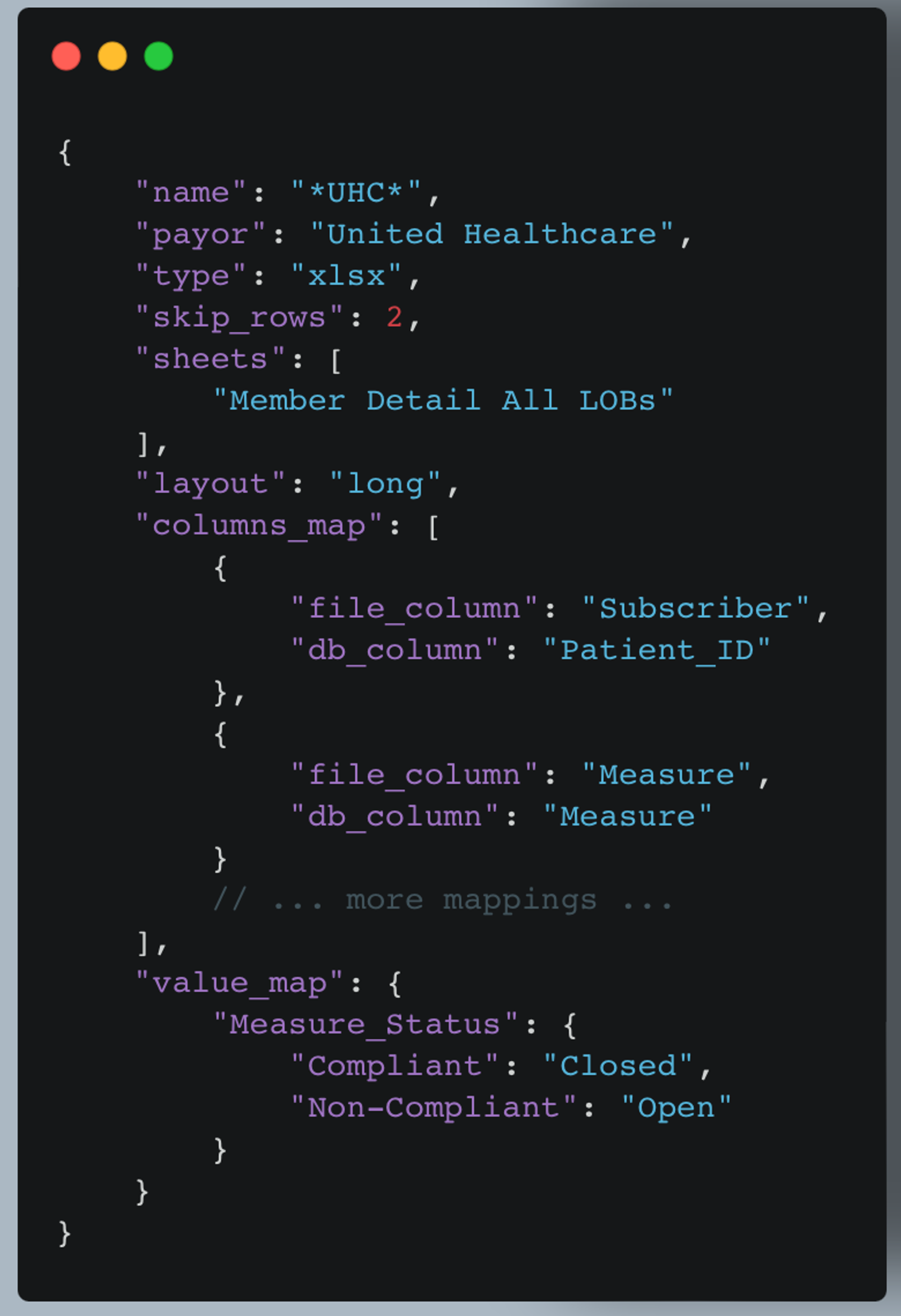 This configuration is for Excel files with "UHC" in the filename. It skips the first two rows, reads from a specific sheet, and includes both column mappings and value standardizations.
