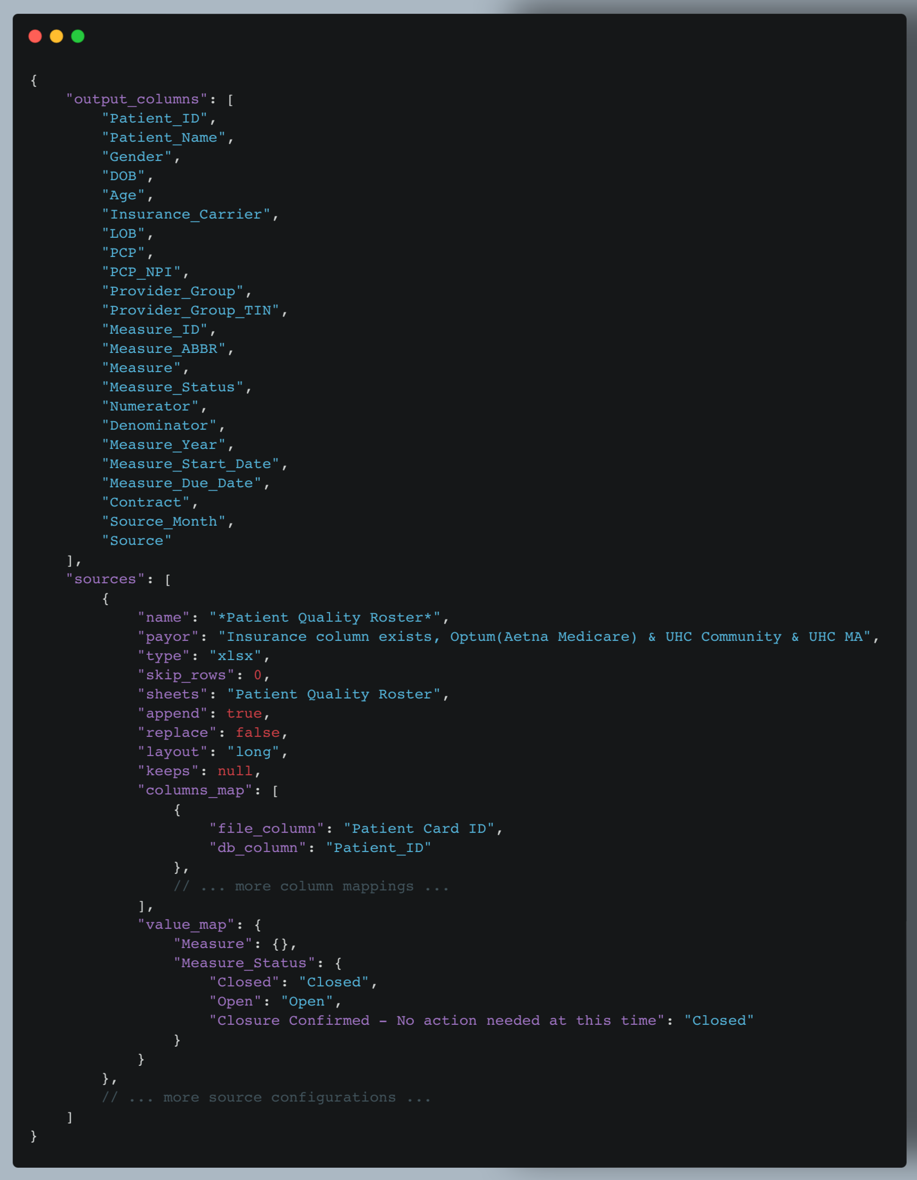 The heart of our system's flexibility lies in its configuration-driven approach. The payor_files_config.json file defines how different source files should be processed. Let's break down its structure: