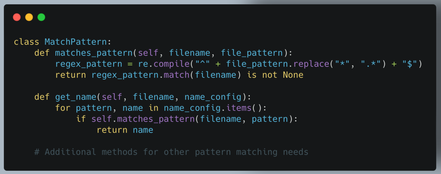 The MatchPattern class provides flexible pattern matching for file names and configurations.