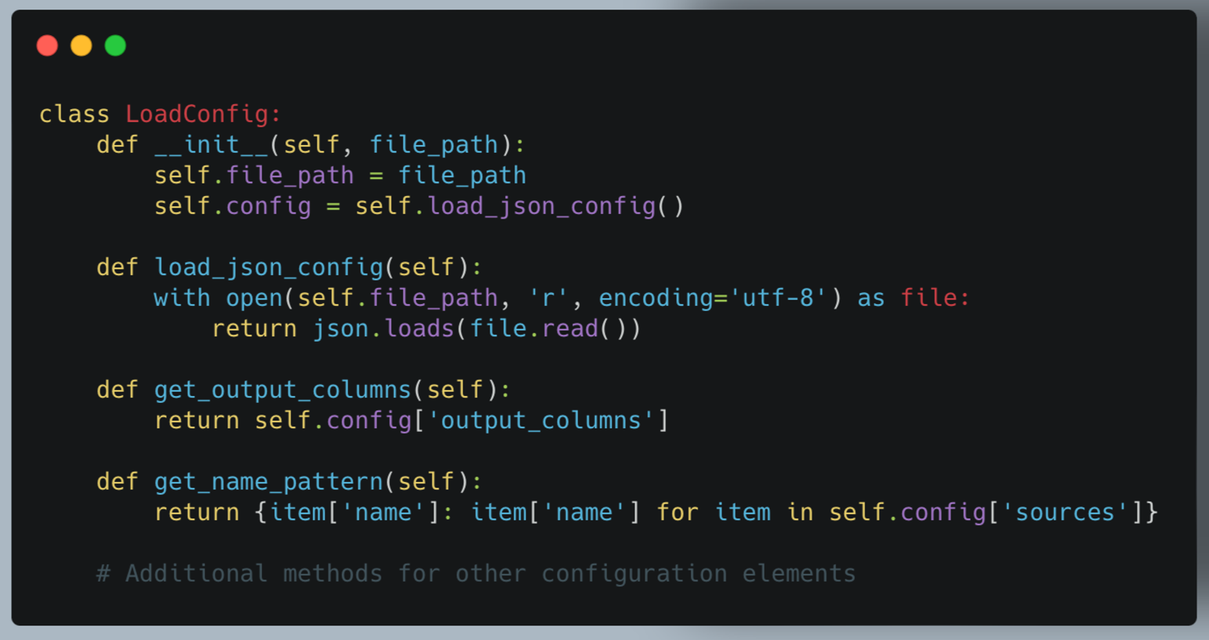The LoadConfig class manages the loading and parsing of JSON configuration files.
