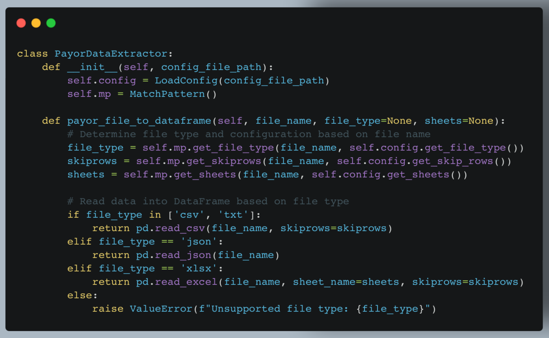The PayorDataExtractor class reads data from various file types and converts them into pandas’ DataFrames.